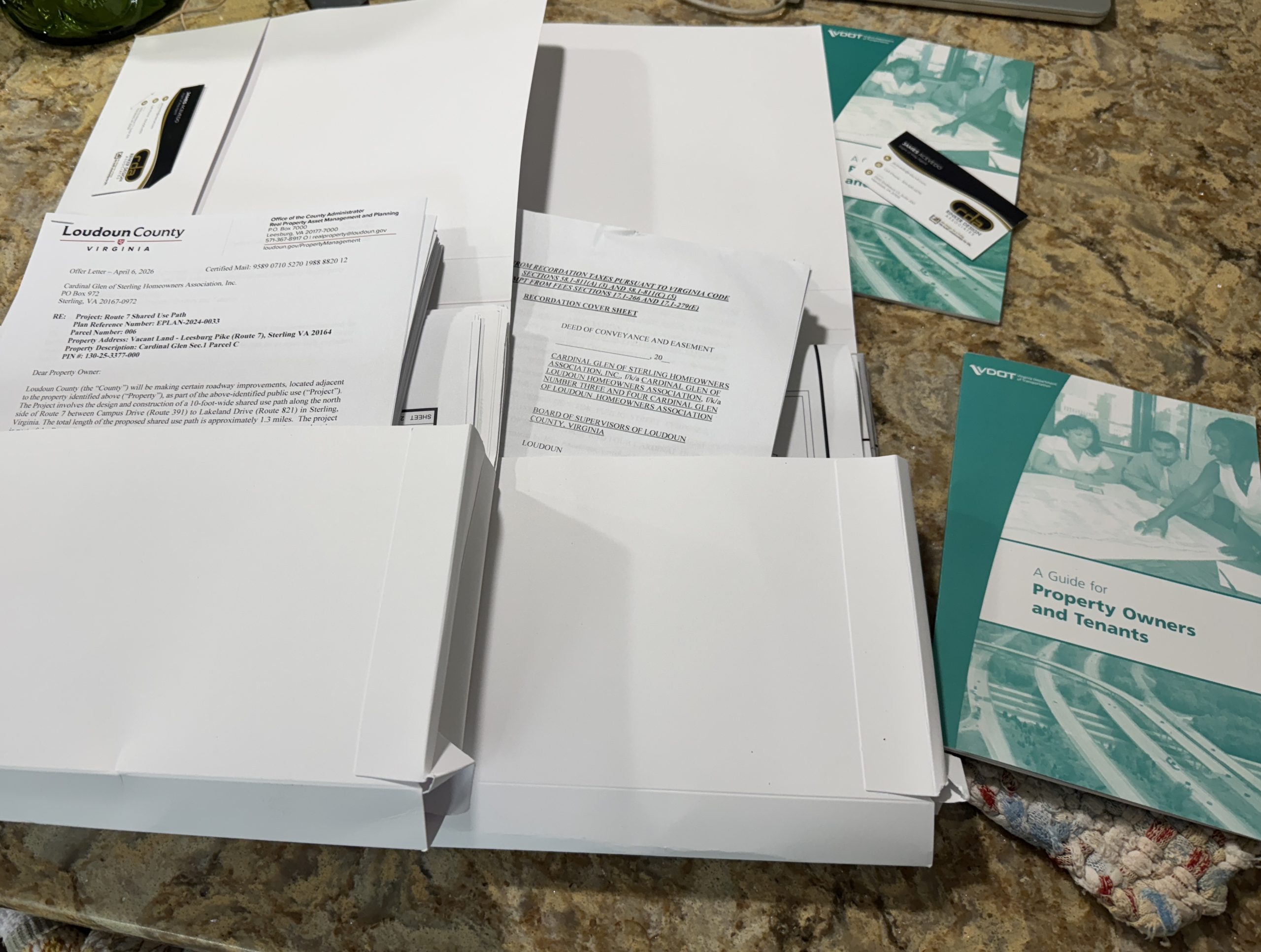 Your HOA is in receipt of this pile of paper, detailing the requested temporary construction & permanent drainage easements needed for the Route 7 Shared Use Path, 1 pile for each piece of common ground (K & C)