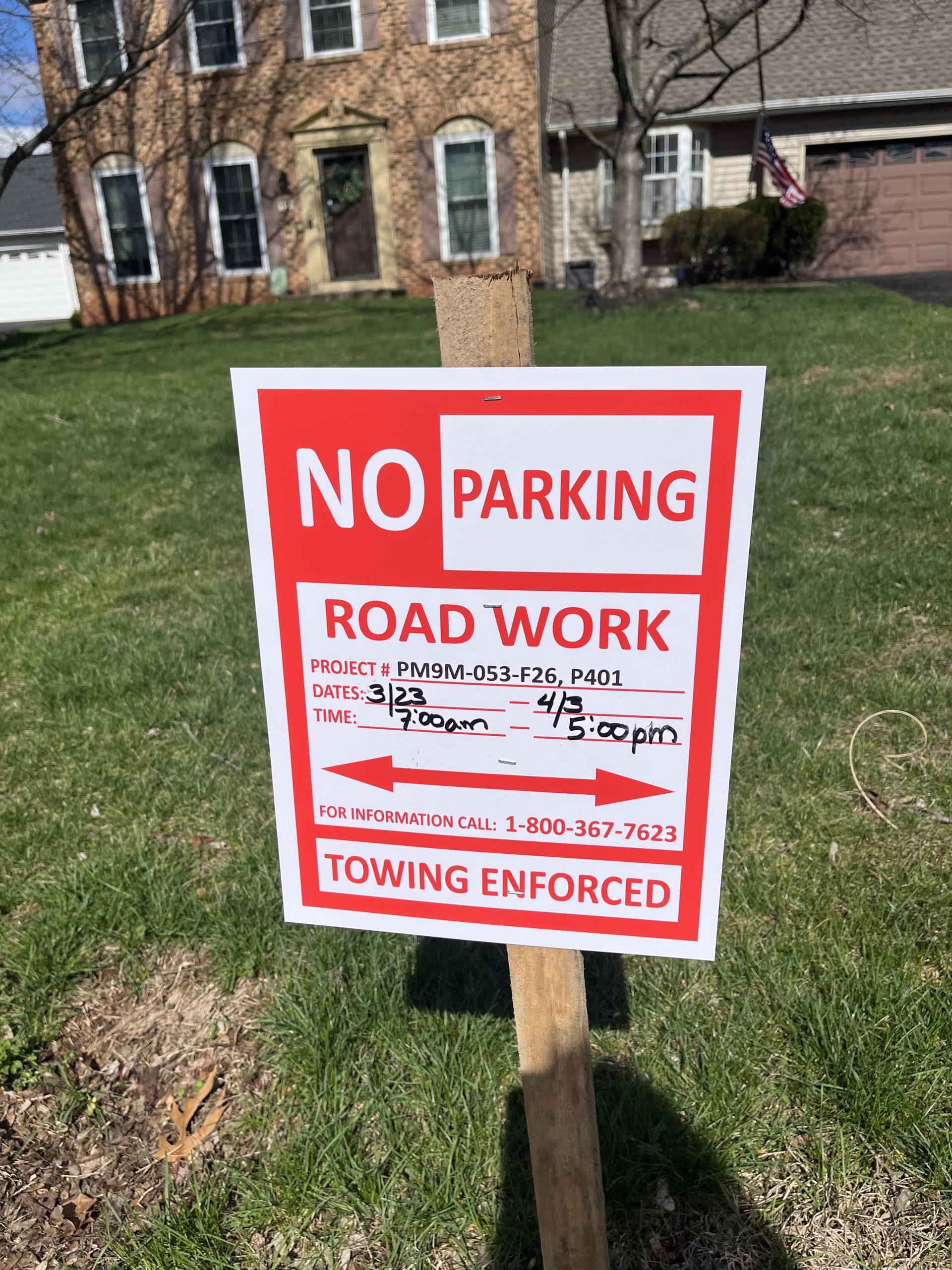 No Parking signs are going up on the courts around CG. The dates of the road work is March 23rd to April 3rd. The phone number is for VDOT, and they are repaving the courts (Cardinal Glen Circle is not part of this paving project). They will likely only do one or two courts per day, and each court should take no longer than 2 days to complete. No one will be parked in, and everyone will have access to their driveway while the work is being done.